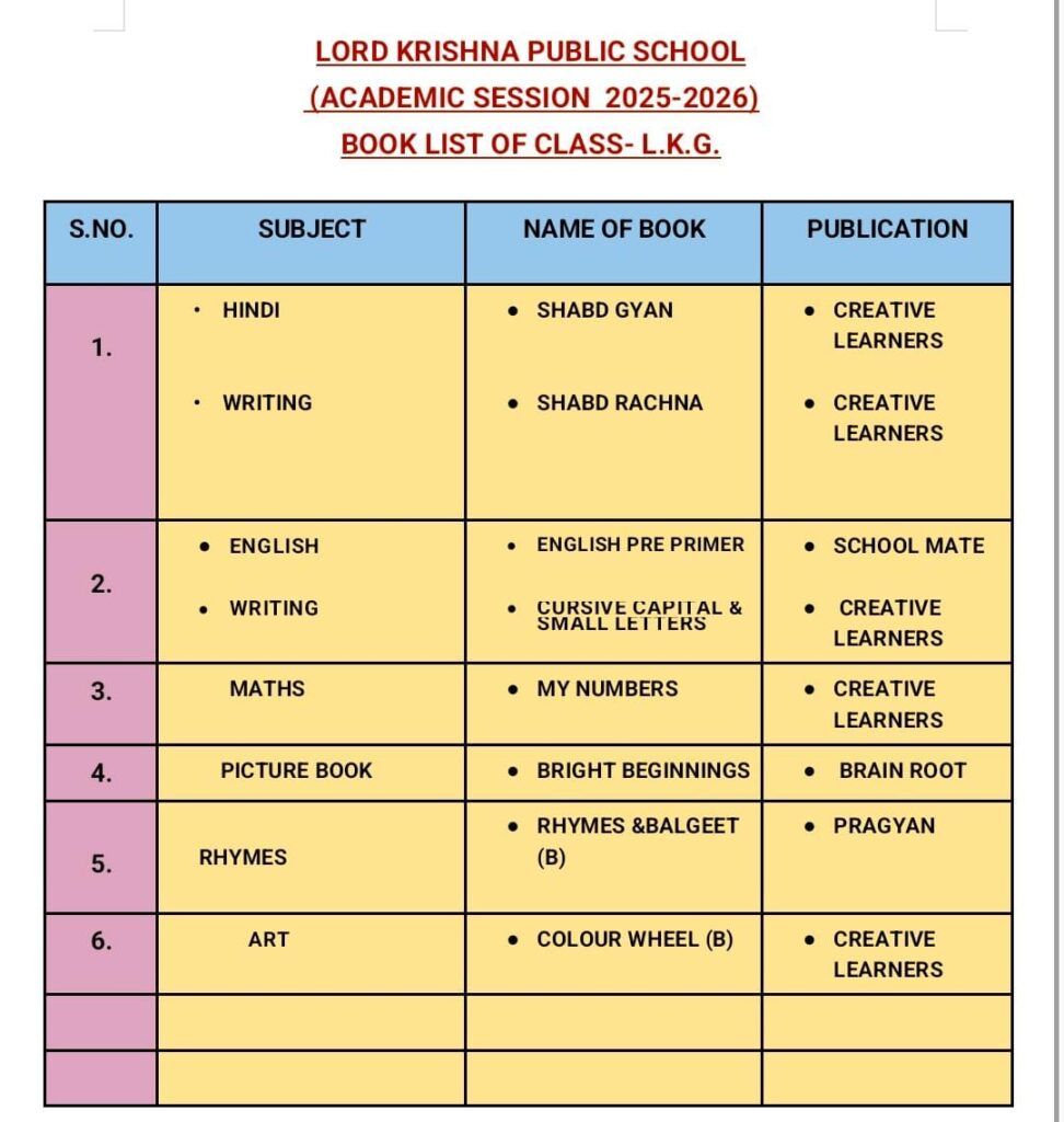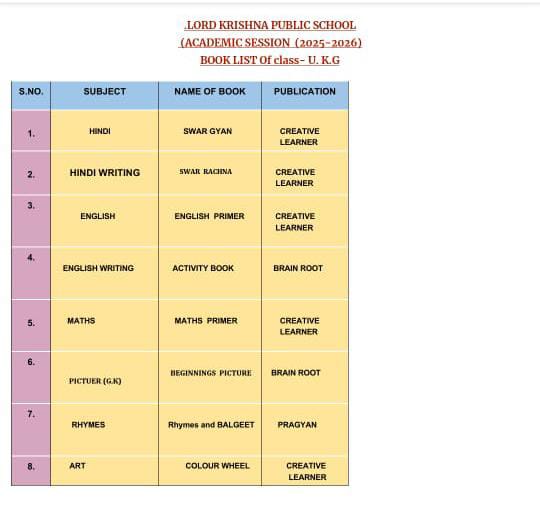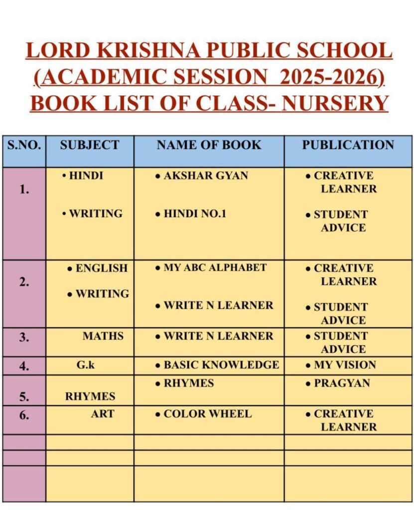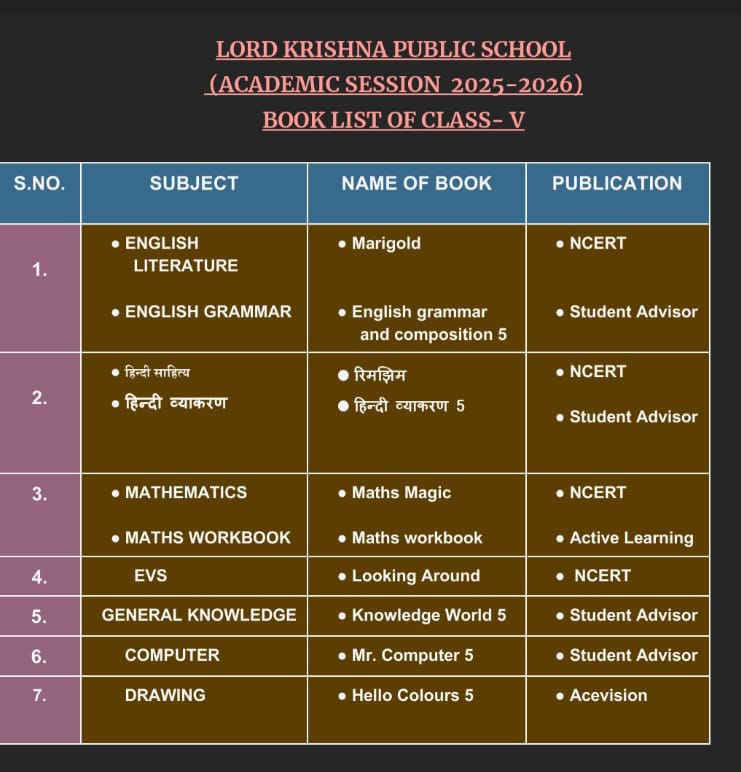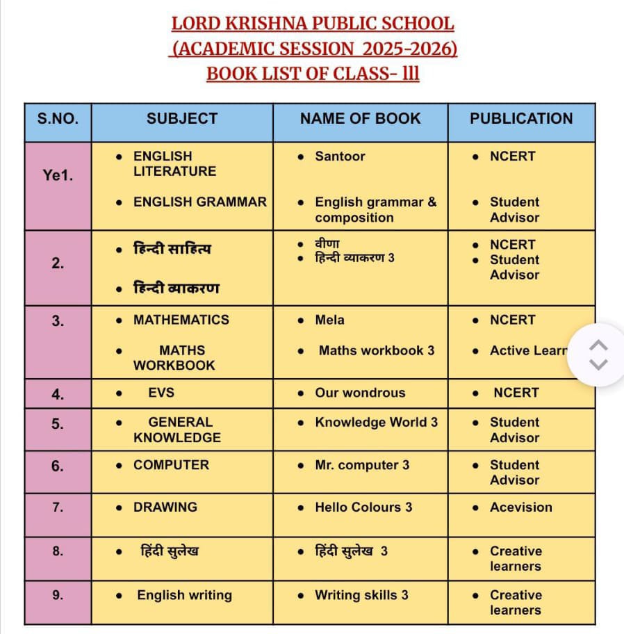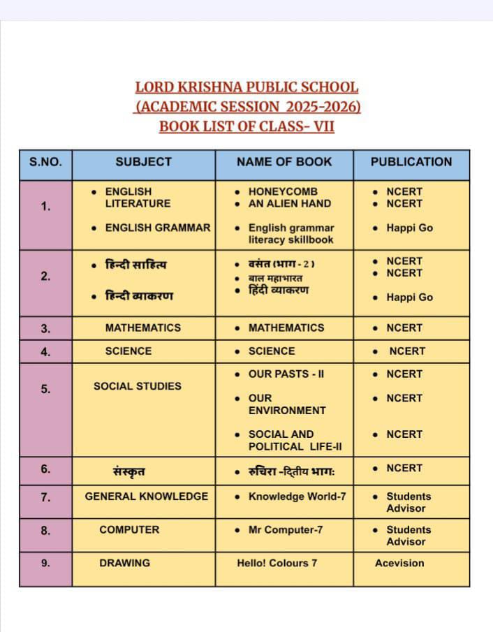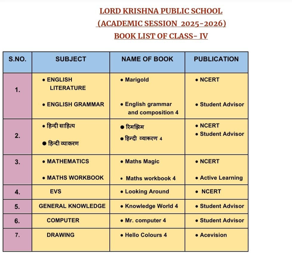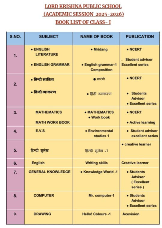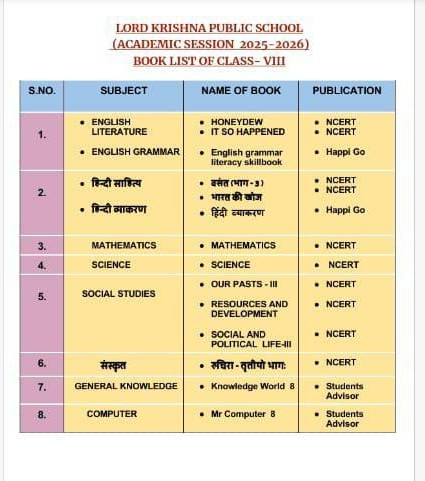 (Academic Session 2025-2026) Book List Of Class (I-VIII)